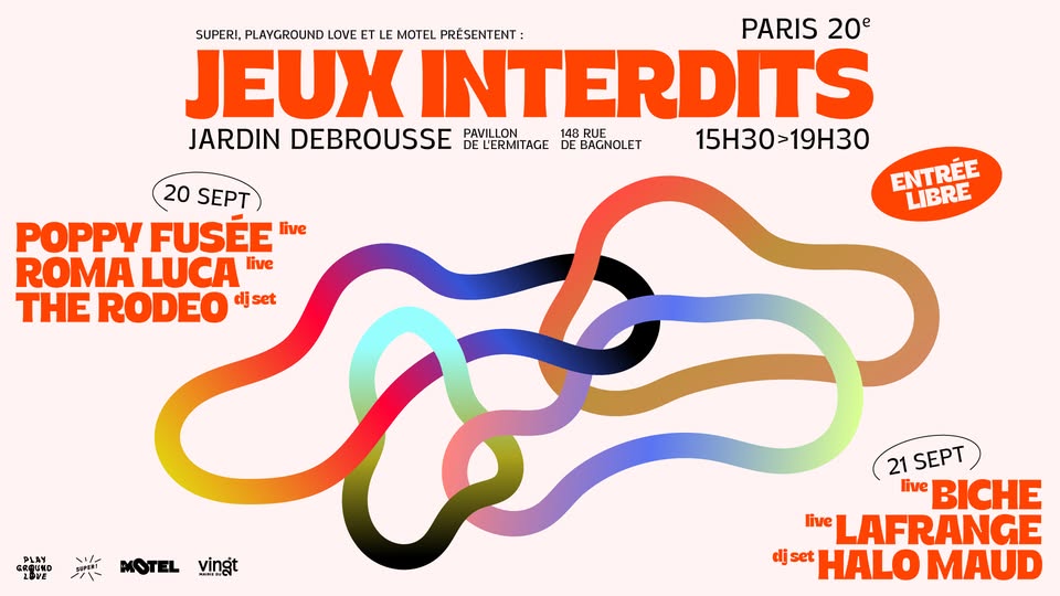 Jeux Interdits, c'est un week-end musical festif, gratuit et en open air, proposé par Super!, Playground Love et Le Motel dans le jardin de l'Hospice Debrousse, devant le Pavillon de l’Ermitage (qui faisait partie de l'ancien château de Bagnolet), les 20 et 21 septembre 2025 de 15h30 à 20h30.